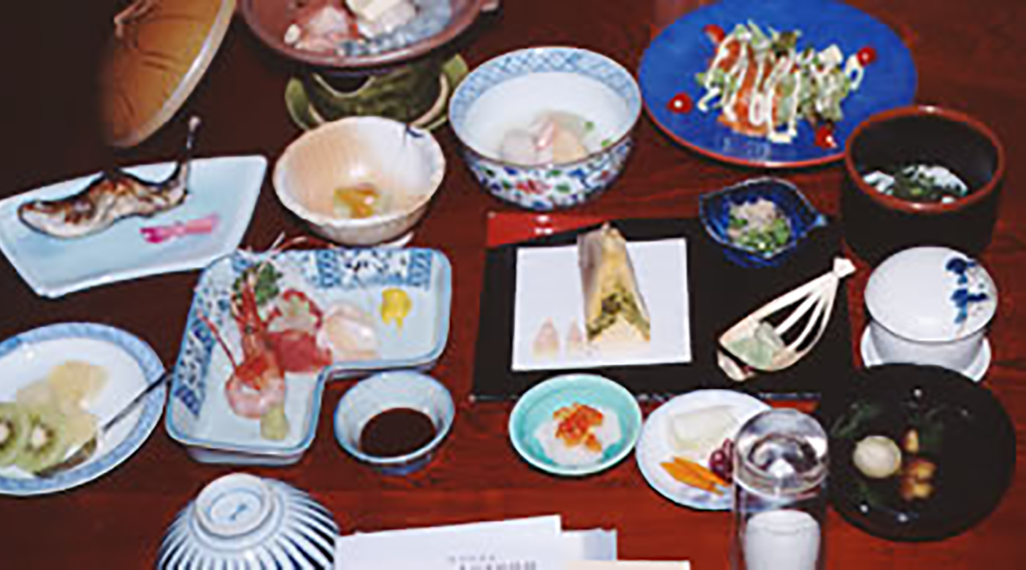 地場の食材はもとより、海の4大味覚(あわび、金目鯛、たらば蟹、さざえ)と伊豆牛が味わえます。