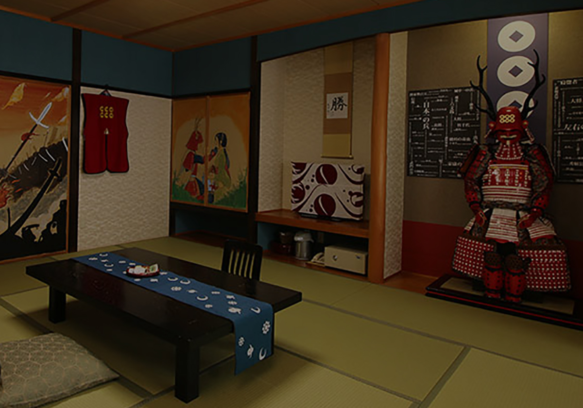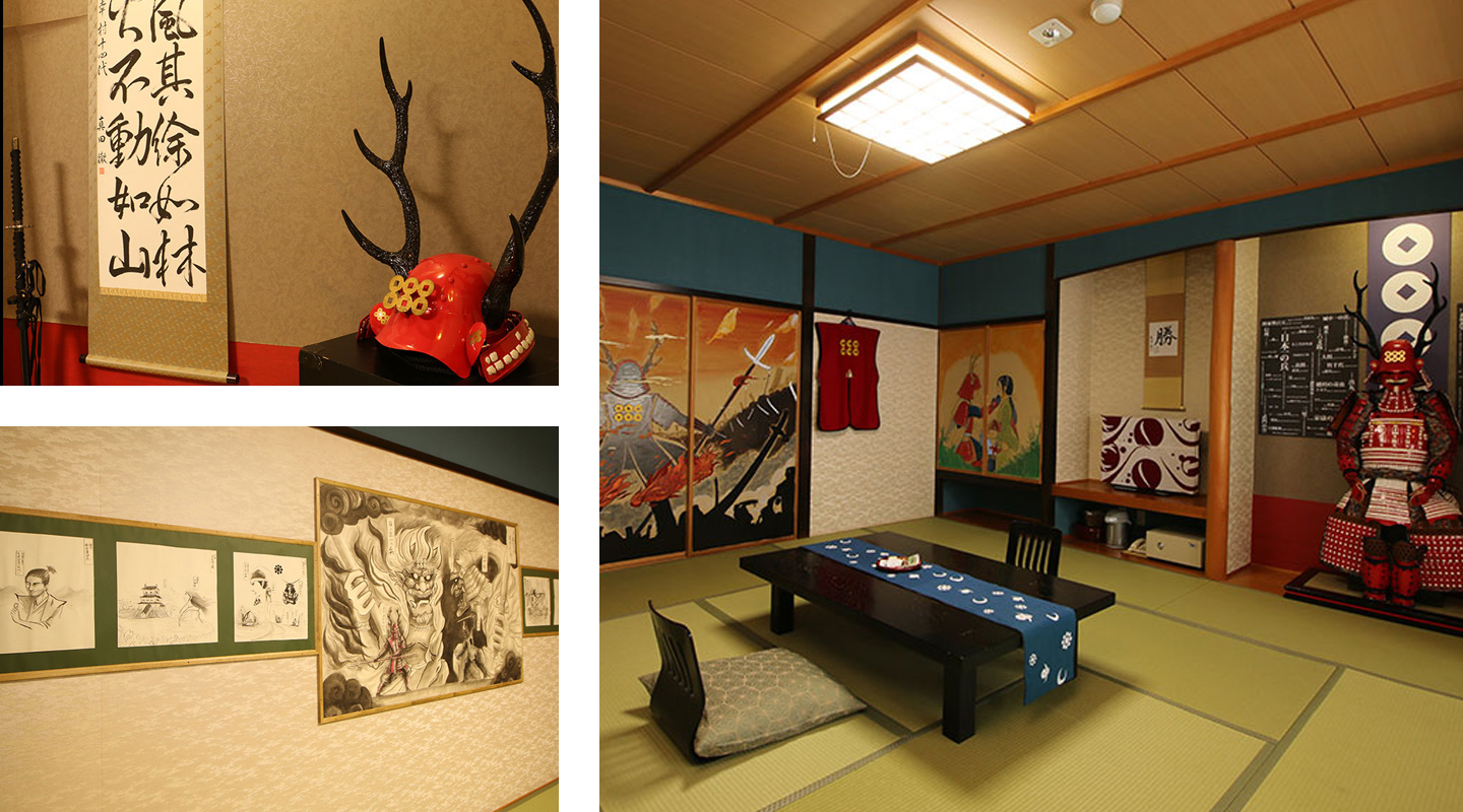真田幸村血脈の郷宮城県蔵王町。ここにしかない特別な空間で仙台真田氏を満喫。お部屋には甲冑や陣羽織、真田の歴史を描く絵が飾られており、歴史を感じながら非日常を体験できます。(1日1組限定)