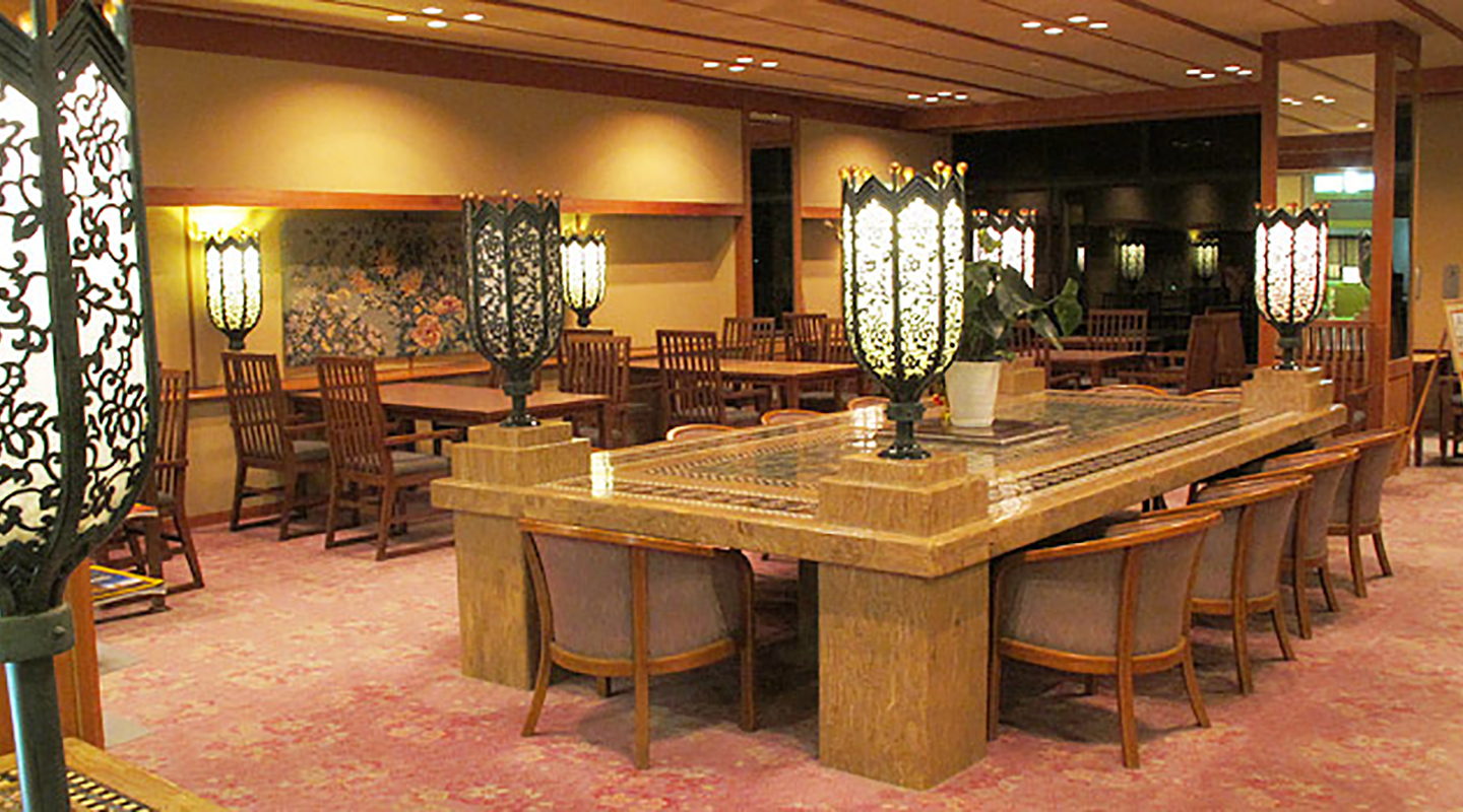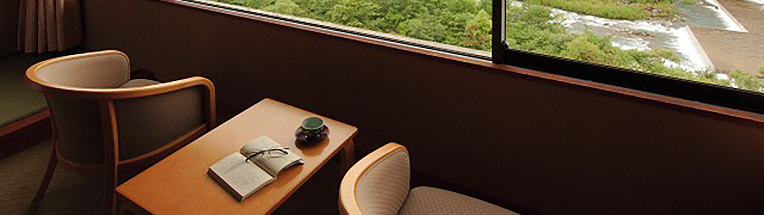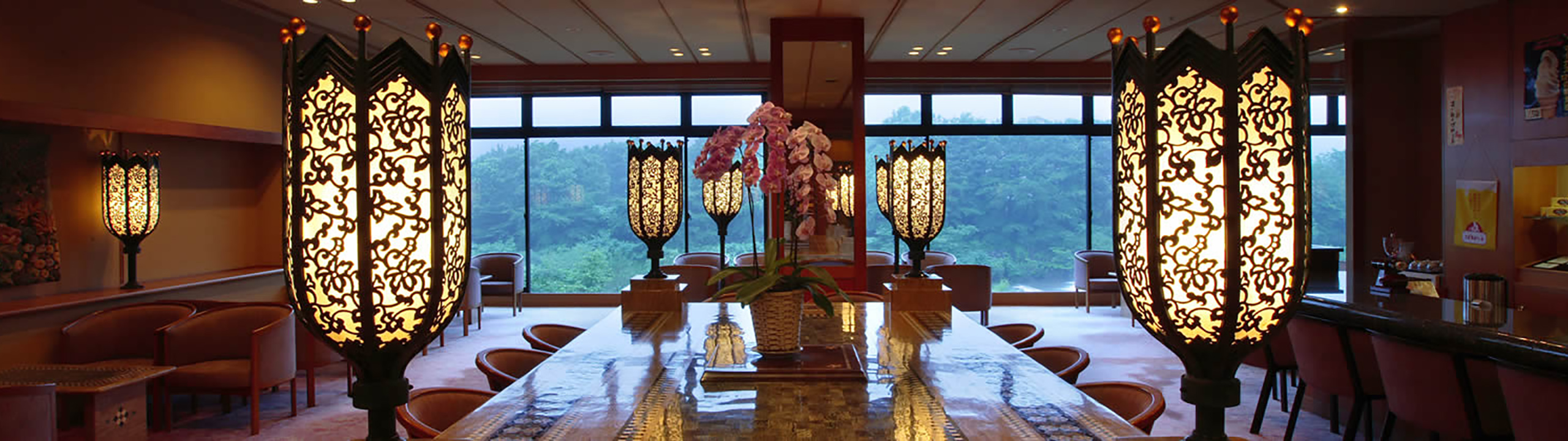 清流を望むラウンジは、アンティークなフロアライトの灯りも優しいくつろぎの空間です。こだわりのコーヒー、お子さまや女性に人気のとろけるようなアイスクリームを召し上がりください。